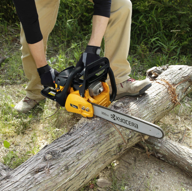 ●キックバック時に、ハンドガードが前に倒れるとソーチェンの回転を停止させるチェンブレーキ付